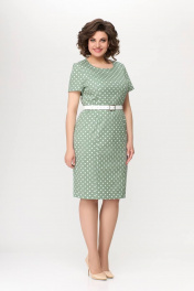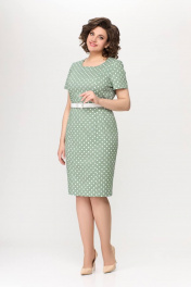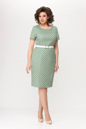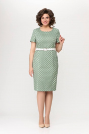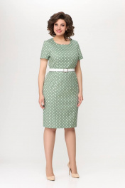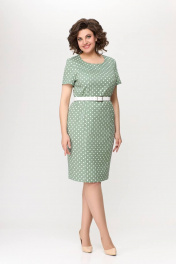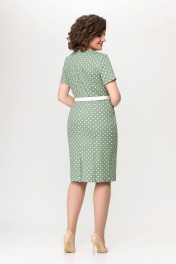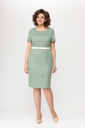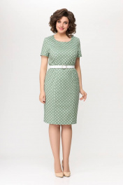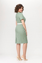 Платье полуприлегающего силуэта из эластичной хлопковой ткани (тонкий деним). Горловина платья круглая. По переду платья расположены рельефные швы. Спинка с рельефными швами и средним швом, в который вставлена потайная молния. По низу спинки обработана шлица. Рукав короткий, втачной, одношовный. В комплекте ремень шириной 3 см с декоративной пряжкой. В зависимости от партии ремень (пряжка) может меняться.