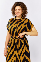 Платье-рубашка из лёгкой вискозной ткани, свободного кроя А-силуэта. Застёжка центральная на петли и декоративные пуговицы. Полочка с нагрудными вытачками, спинка цельная. Воротник рубашечного типа, отложной со стойкой. Пройма спущенная с отложной манжетой. В боковых швах обработаны карманы. По желанию подчеркнуть талию можно поясом, идущим в комплекте. Длина по спинке – 118 см.