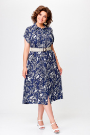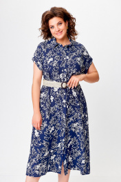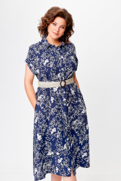 Платье-рубашка свободного кроя, расклешённое к низу. Застёжка центральная на петли и декоративные пуговицы, пройма спущенная с отложной манжетой. Спинка цельная. Воротник отложной со стойкой. В боковых швах предусмотрены карманы. По желанию подчеркнуть талию можно ремнём, идущим в комплекте. Длина по спинке – 118 см.