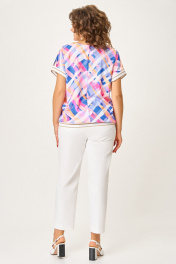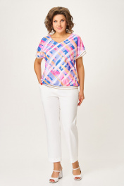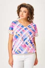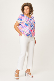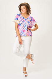Блузка из мягкой вискозной ткани свободного силуэта со спущенной линией плеча. Полочка цельная, спинка с центральным швом. Горловина V-образной формы. Низ блузки и низ цельнокроенного рукава обработаны декоративным трикотажным довязом. Длина блузки по центру спинки – 61 (+-1) см. Длина плечевого шва – 29 (+-1) см.