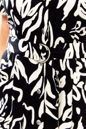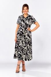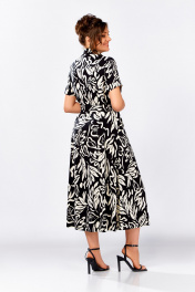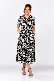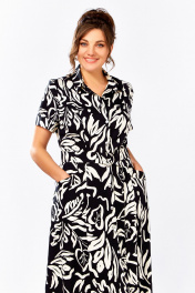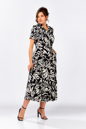 Платье из мягкой вискозной ткани, отрезное по линии талии с полуприлегающим лифом и юбкой А-силуэта, с центральной застёжкой на петли и декоративные пуговицы. Полочка с вертикальными рельефами, спинка с кокеткой и отрезными бочками. Юбка состоит из семи клиньев. По переду между швами обработан карман с планкой на косую. Воротник отложной рубашечного типа, с отрезной стойкой. Рукав втачной короткий, по низу с отложной манжетой. Платье комплектуется поясом из основной ткани с декоративными полукольцами. Длина рукава – 22 см. Длина платья по спинке – 125(+/- 1) см.