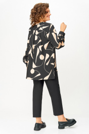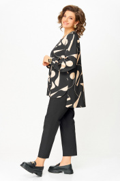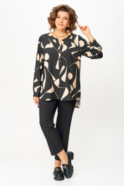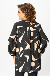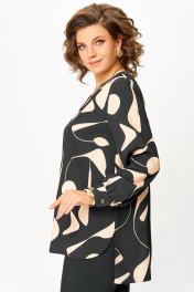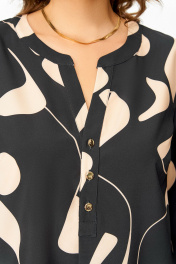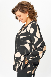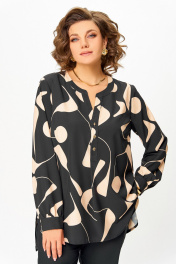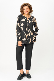 Блузка женская свободного силуэта, выполнена из вискозной ткани. По полочке нагрудные вытачки и фигурная планка до талии с застёжкой на 3 петли и 3 декоративные пуговицы, в низу под планкой, на полочке заложена односторонняя складка. Спинка с отрезной кокеткой и бантовой складкой. Горловина округлой формы с притачной стойкой и V-образным вырезом по планке. Рукав втачной, одношовный внизу со сборкой и манжетой, которая застёгивается на петлю и пуговицу. Низ полочки закруглённой формы, низ спинки прямой и длинее полочки на 6 см. Длина по центру спинки р.52,54,56 – 75 см. р.58,60,62 – 78 см. Длина рукава – 63 см.