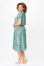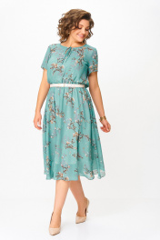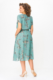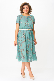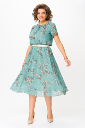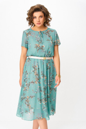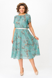 Платье из мягкой шифоновой ткани, на трикотажной подкладке, отрезное по линии талии, шов собран на эластичную тесьму-резинку. Горловина округлой формы, по переду капелька с завязкой. Рукав втачной, короткий. Юбка расклешённая. Подкладка лифа платья на бретелях. В подарок ремень с декоративной пряжкой. Длина рукава 21см (+ /- 1 см) Длина платья по спинке 118 см (+ /- 2 см)