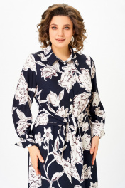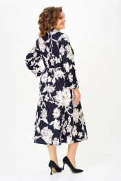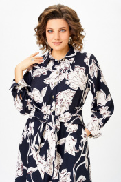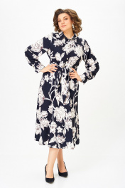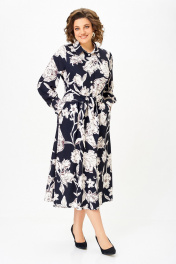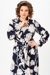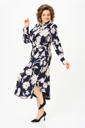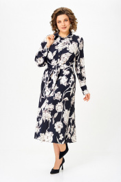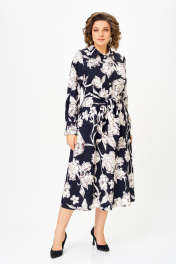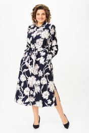 Платье из хлопка Х-образного силуэта с полуприлегающим лифом. Платье отрезное по линии талии. Перед лифа со складками, выходящими из талиевого шва, доходящими до линии груди, и центральной застёжкой на 6 петель и пуговиц. Перед юбки с боковыми наклонными карманами. По шву притачивания лифа спинки к юбке спинки частично вставлена резинка. В боковом шве, в области талии втачивается пояс из основной ткани. Воротник стояче-отложной, рубашечного типа. Рукав втачной, одношовный длинный, внизу со складкой и манжетой, которая застёгивается на петлю и пуговицу. Длина рукава 64 см. (+/-1) см Длина изделия по спинке – 123 см. (+/-1) см