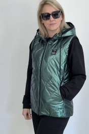 Комплект женский трехпредметный, состоящий из жилета, свитшота и брюк. Жилет полуприлегающего силуэта из плащевой ткани стеганной на синтепоне, на подкладке. Застежка спереди, центральная, на тесьму молния. Горловина оформлена капюшоном с кулисой по краю. Жилет чуть притален за счет подрезных бочков. Спереди карманы в рельефах. Вход в карман полукруглой формы. Проймы жилета, вход в карман и бейка капюшона под кулису - из трикотажного полотна. Свитшот прямого силуэта с длинным рукавом. Рукав со спущенной линией плеча, снизу на манжете. По переду и спинке смещенные рельефы. Перед задекорирован выразительным принтом. Вырез горловины круглой формы с подрезной бейкой. Брюки длинные, прямые. По бокам наклонные карманы. Пояс притачной с резинкой по кругу.