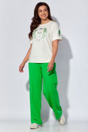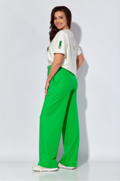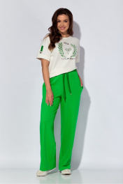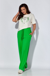Комплект женский, 2х предметный, состоящий из свободной футболки и брюк. Футболка прямого силуэта с коротким рукавом. Рукав со спущенной линией плеча, по низу с манжетой, по центру задекорирован отделочной тесьмой с полукольцом. Горловина круглой формы с подрезной бейкой. Перед задекорирован принтом. По низу отрезная планка. По спинке кокетка и настрочная деталь с открытым срезом, задекорированная принтом. Брюки-палаццо. По переду застрочены защипы "стрелки". Карманы в боковых швах. Пояс цельнокроеный с резинкой по кругу. По переду петли и отделочная тесьма.