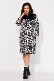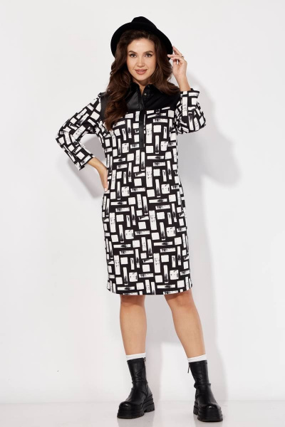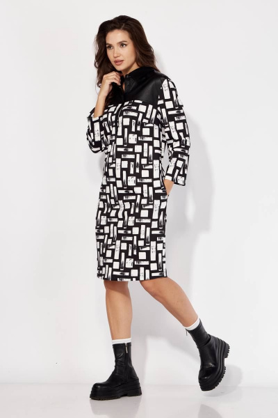 Платье женское, полуприлегающего силуэта с втачным рукавом длинной 7/8. По переду нагрудные вытачки и кокетка. Воротник отложной, на отрезной стойке. Застежка по центру с удлиненной планкой "поло" на кнопках. Карманы в боковых швах. По спинке кокетка и талевые вытачки. Платье выполнено из трикотажного полотна с отделкой из экокожи(кокетка, воротник, планка).