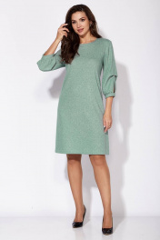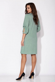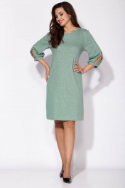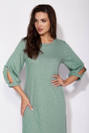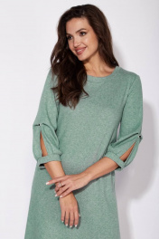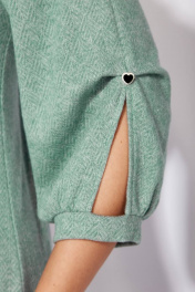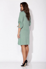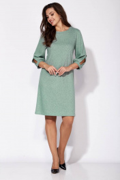 Платье женское, А образного силуэта с рукавом длиной 3/4 . Рукав фантазийной формы, к низу расширен и присобран на притачную манжету. По центру рукава шов, к низу переходящий в разрез. По шву мягкая складка, акцентированная пуговицей. Вырез горловины круглой формы с подрезной бейкой. Спинка без особенностей.