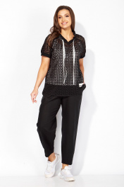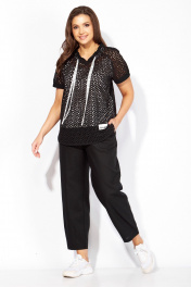 Комплект женский, 2х предметный, состоящий из блузки и брюк. Блузка прямого силуэта с коротким рукавом покроя "реглан" По низу рукава манжета с резинкой. Вырез горловины расширенный, Y-образной формы рюшей и кулисой из отделочного шнурка. Низ блузы фигурной формы. Перед частично на подкладке. Брюки слаксы, свободные, длинной 7/8, По переду карманы и имитация гульфика. По низу брюк вытачки. Пояс притачной с резинкой по кругу.