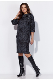 Платье женское, прямого силуэта с цельнокройным рукавом, длной 3/4. По переду и спинке фигурные рельефы. По переду карманы в рельефах с отделочной отстрочкой. По низу, в боковых швах, разрезы. Горловина оформлена небольшой , мягкой, цельнокройной строчкой. Декором служит съемное украшение (цветы) с цепочкой.