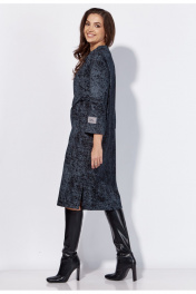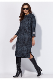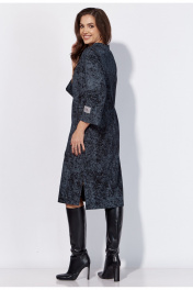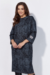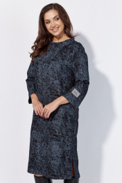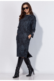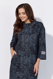 Платье женское, прямого силуэта, с рукавом длинной 7/8. Рукав со спущенной линией плеча. По переду и спинке отрезные кокетки. Спереди рельефные швы от кокетки и функциональные карманы в рельефах. По спинке средний шов от кокетки. Низ платья по спинке удлинен, с разрезами по бокам. Горловина круглой формы, оформлена расширенной стойкой. На рукаве отделочная нашивка.