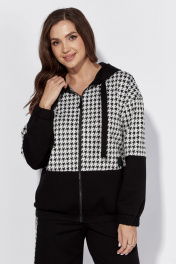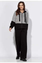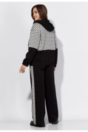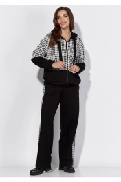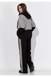 Комплект женский, 2х предметный, состоящий из бомьера и брюк. Бомбер прямого силуэта с длинным рукавом. Рукав со спущенной линией плеча. По низу рукава манжета с резинкой .По переду застежка центральная на тесьму "молния" и функциональные карманы. Горловина оформлена капюшоном с широкой кулисой по краю. На концах кулисы металические зажимы. По низу бомбера, манжета с резинкой по спинке. Брюки прямые. По боку широкий лампас с отделочным кантом. Карманы функциональные в швах. Пояс притачной с резинкой сзади и частично спереди.