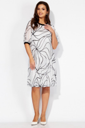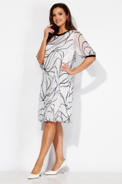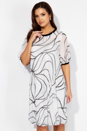Платье женское, А-силуэта, снизу по типу "балон" Платье выполнено из трикотажной сетки на трикотажной подкладке. По низу глубокие, мягкие складки. Горловина круглой формы, с подрезной бейкой. Рукав короткий, со сборкой снизу, на узкой манжете. Бейка горловины и манжеты рукава из отделочного трикотажного полотна. Горловина акцентирована спереди декоративной пуговицей. Сзади отделочной нашивкой.