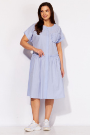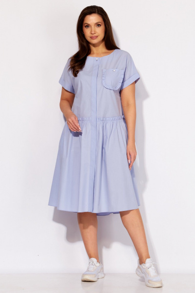 Платье женское, свободного силуэта, расширенное к низу, с коротким цельнокройным рукавом. По низу рукава манжета. Платье отрезное ниже линии талии. Нижняя часть платья со сборкой и отлетной рюшей. Вырез горловины круглой формы. Застежка центральная, на петли и пуговицы, с потайной планкой. На полочке, слева, накладной карман с рюшей и декоративной пуговицей. По лифу спинки средний шов. По низу, сзади, низ платья удлиннен.