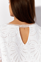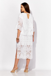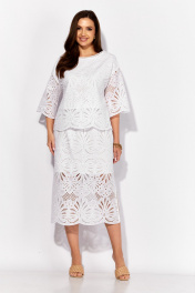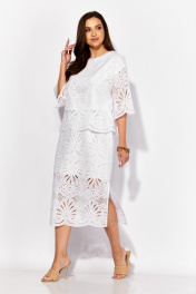 Комплект женский, 2х предметный, состоящий из блузки и юбки. Блузка прямого силуэта с рукавом длинной 3/4. Рукав со спущенной линией плеча. Вырез горловины "лодочка", расширенный, с отделкой кружевной тесьмой. По спинке фигурный вырез акцентирован отделочной "манжетой" Лиф блузки на подкладке. Юбка прямая, с разрезом сбоку. Пояс цельнокройный с резинкой по кругу. Юбка на подкладке.