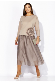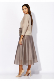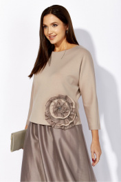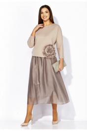 Комплект женский, 2х предметный, состоящий из блузки и юбки. Блузка полуприлегающего силуэта с цельнокройным рукавом длинной 3/4. Выполнена из трикотажного полотна "ТЕНСЕЛ". Вырез горловины "лодочка" По низу блузки, слева, декоративный элемент из рюши, в сочетании двух видов ткани. По спинке средний шов. Юбка широкая к низу, из текстильной ткани "вуалька" На подкладке. Пояс притачной с резинкой по кругу.