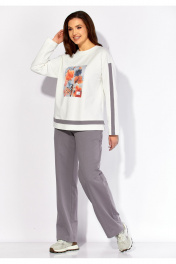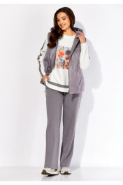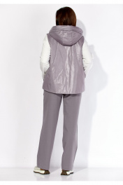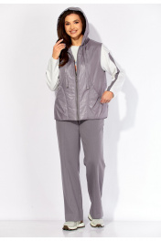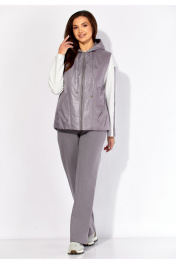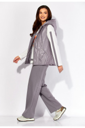 Комплект женский, 3х предметный, состоящий из жилета свитшота и брюк. Жилет прямого силуэта, из плащевки на синтепоне, на подкладке. По переду рельефы из горловины. В рельефах карманы с мягкими складками. Застежка центральная, на "молнию" Горловина оформлена капюшоном с кулисой. По спинке рельефы в боковой шов. Свитшот прямого силуэта с длинным рукавом. Рукав со спущенной линией плеча. Горловина круглой формы с подрезной бейкой. По центру рукавов и низу свитшота вставки(полоски) из полотна контрастного цвета. По бокам разрезы. Перед задекорирован принтом. Брюки прямые, с карманами. Спереди рельефы с отделочными строчками. Пояс притачной, частично на резинке.