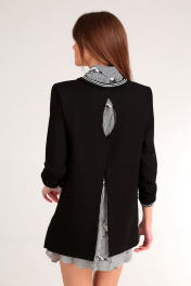 Комплект женский, состоит из блузы удлиненной без рукавов, выполненной из блузочной ткани и блузона, который надевается поверх блузки. Блузон прямого силуэта, выполнен из трикотажной ткани. Спинка состоит из двух удлиненных деталей с фигурным краем по центру спинки. Полочка укорочена, имеются фигурные вытачки, низ отделан трикотажной резинкой. Так же с трикотажной резинки выполнены манжеты и горловина. Блуза женская, прямого силуэта, удлиненная. Застежка центральная на планку. Воротник рубашечный, на стойке. Низ изделия закругленный, с разрезами по бокам. Проймы блузы отстрочены, обработаны нагрудные вытачки.