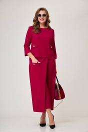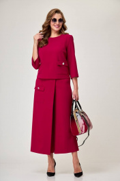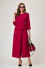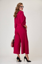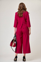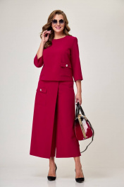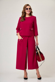Очень стильный, элегантный женский комплект, состоит из кюлот и блузона. Спереди блузона 2 функциональных кармана с декоративными пуговичками. Рукав втачной, ¾ длина рукава — 47 см. Сзади на кокетке, переходящей к середине в разрез. Длина блузона по спинке от плеча - 56 см. Кюлоты с отлетной деталью спереди и функциональным карманом с декоративной пуговичкой. Длина брюк — 93 см, пояс сзади на резинке.