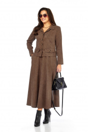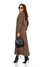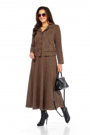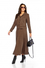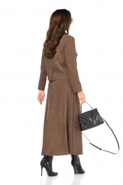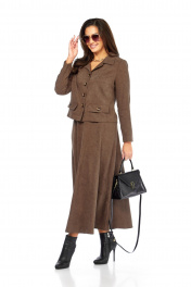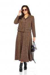 Стильный, элегантный женский комплект из ткани микровельвет/ штрукс в мелкую полоску/. Жакет полуприлегающего силуэта, с интересным отложным воротником, с клапанами по низу жакета и пуговицами на них. Рукав длинный, длина рукава- 60 см. Сзади шов, переходящий в шлицу. Длина жакета от плеча сзади — 55 см. Юбка очень стильная п/ солнце, очень красиво ложится фалдами , это хорошо видно на фото. Сбоку юбки функциональные карманы, пояс по бокам на резинке. Длина юбки — 92 см.