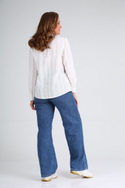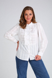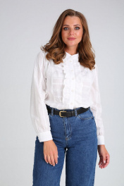 Хлопковая блуза прямого силуэта с центральной застежкой на планку с пуговицами. Воротник-стойка. Перед с рельефами, переходящими в горизонтальный подрез на уровне талии. В планку от воротника до подреза вставлена рюша. Рукав втачной одношовный. Низ рукава присобран на функциональную манжету. Длина блузы: 66см. Длина рукава: 61см.