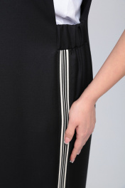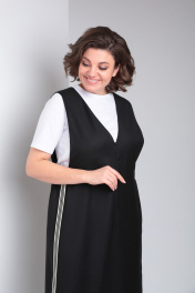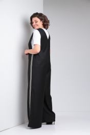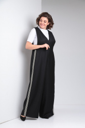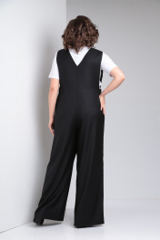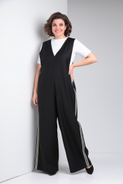 Комбинезон из костюмной ткани,прямого силуэта с завышенной линией талии и резинкой по бокам, V- образным вырезом по спинке и переду, с застежкой «молнией» в среднем в среднем шве переда. В боковых швах расположены карманы. Длина по боковому шву 113. Футболка из трикотажной ткани с хлопком прямого силуэта с коротким рукавом.