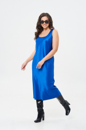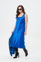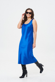 Платье без подкладки из сатина, по косой, слегка расширенное к низу. С нагрудными вытачками на переде и талиевыми по спинке. Вырез горловины круглый. Длина по спинке 120.
