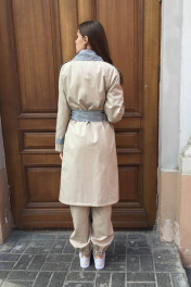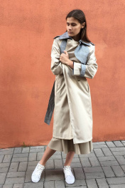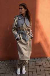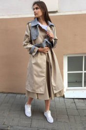 Тренч покроя реглан,карманы листочки,с погонами и патами.Отделка черно-серая.Пояс