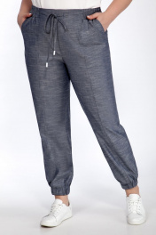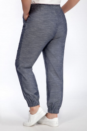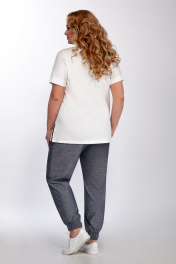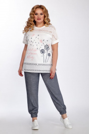Комплект женский двух предметный. Блуза свободного кроя из тонкого трикотажного полотна и ришелье. Вырез горловины округлой формы. Рукав со спущенной линией плеча, заканчивается манжетой. Перед декорирован печатью. Брюки свободного кроя из легкой ткани под джинс. Пояс отрезной, перфорирован эластичной тесьмой, и декорирован кулисой. По переду обработаны накладные карманы, низ брюк собран на эластичную тесьму. Длина брюк ок 100 см Длина блузы ок 70 см