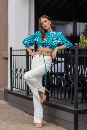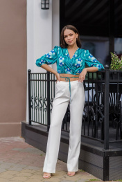 Комплект состоит из блузы и брюк. Блуза короткая, V- образный вырез горловины, блуза на запах с декоративными завязками из основной ткани которые завязываются вокруг талии, (блузу можно носить как с вырезам спереди так и с вырезом сзади) низ блузы и низ рукава присборены на эластичную тесьму, рукав 3/7 фонарик. Брюки с легка расклешенные к низу на поясе, застежка на крючок и тесьму молнию. В низу по боковому шву брюк находятся шлицы.