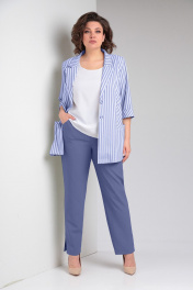 Женский комплект-тройка, состоящий из жакета, брюк и блузы, которые можно носить отдельно друг от друга, дополняя другими предметами гардероба. Стильная полоска жакета — это яркий акцент, а мягкий однотон брюк — лучший для него компаньон. Светлая, базовая блуза освежает комплект и добавляет нужный контраст в верхней части образа. Жакет полуприлегающего силуэта с центральной бортовой застёжкой на две петли и пуговицы. На переде обработаны рельефные швы и внутренние карманы с листочкой. Спинка со средним швом и талиевыми вытачками. Рукав втачной, длиной ¾, с отложной манжетой. Горловина обработана английским воротником. Брюки прямые, на притачном поясе с пуговицей и резинками в районе боковых швов. На передних половинках обработаны функциональные карманы. В боковых швах по низу брюк небольшие разрезы. Блуза с коротким рукавом и нагрудными вытачками на переде. Горловина овальной формы обработана окантовкой. Отделкой комплекта служит фурнитура (может отличаться от представленной на фото). Длина жакета от центра горловины спинки до низа: в 54-58 р-рах — 71,5 см.; в 60-64 р-рах — 72см. Длина рукава: 43 см. Длина брюк по боковому шву без учёта пояса: 99 см. Длина блузы от центра горловины спинки до низа: в 54-58 р-рах — 63см.; в 60-64 р-рах — 66см.