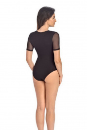 Боди-слипы прилегающего силуэта. Втачнве короткие рукава и фигурная кокетка спереди выполнены из полупрозрачного полотна. Застежка на крючки-петли. Аккуратный круглый вырез горловины.