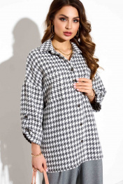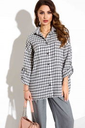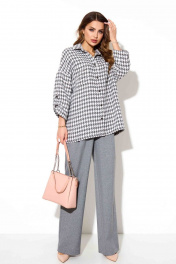 Комплект из рубашки и брюк. Рубашка свободного покроя. Рукав на спущенной пройме, прямой укороченный, с патой и с отворотом. Рубашечный воротник, застежка на пуговицы. По спинке кокетка. Брюки «палацио»: высокая посадка, от пояса заложены складки, застежка на молнию и пуговицу, наклонные карманы по переду и листочка-обманка по спинке. Длина рубашки 74 Длина рукава 58 Длина брюк 106