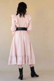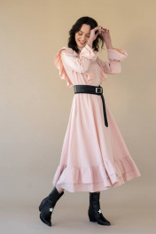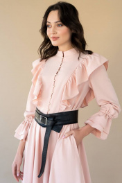Стильное платье.По талии отрезное. Юбка длинная с притачным воланом. Перед с декоративной застежкой на петли и пуговицы ,длинный рукав на резинке с притачным воланом.По переду выполненны отделочные рюши. На спинке потайная молния. Воротник- маленькая стойка. Пояс в комплекте. Платье выполнено из легкой вискозной ткани. Прекрасно для летних вечеров. Длина платья 130см, длина рукава 65см