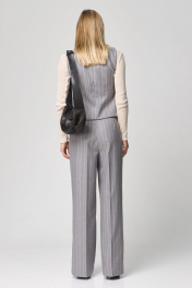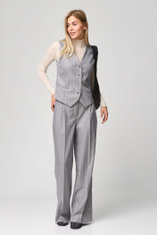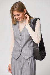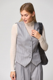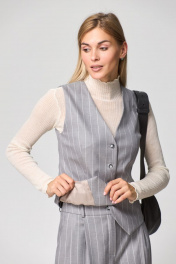 Такой предмет женского гардероба, как жилет, не оставляет равнодушной ни одну модницу. .Жилет приталенного силуэта с застежками по переду на четыре петли-пуговицы. По переду талиевые выточки, функциональные карманы c листочкой, вырез V-образный, спинка разрезная по центру с двумя талиевыми выточками, низ фигурный. Жилет на подкладке , выполнен из ткани костюмной группы светло-серого цвета в полоску. Идеально можно сочетать с любыми брюками нашего бренда.Длина по спинке 60 см.