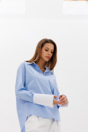 Рубашка свободного кроя. Рукав рубашечный, линия плеча спущена, рукав с притачной, отложной манжетой. Застёжка центральная на петли - пуговицы. Низ блузки фигурной формы. Воротник стояче-отложной с отрезной стойкой..Рубашка - база в гардеробе, сочетать можно с атласными брюками, юбками из кожи, трикотажными изделиями..Длина по спинке 71см, длина рукава от линии шва 55см.