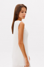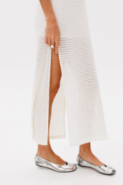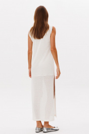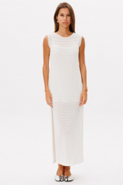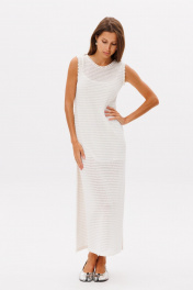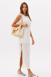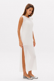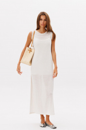 Лаконичное базовое трикотажное платье в молочном цвете, платье состоит из двух изделий в комплекте с комбинацией на бретелях . Платье прямого кроя, по горловине и рукавам отстрочено декоративной лентой, по бокам разрезы.Длина изделия 132 см.Высота разреза 52 см в 42 -м размере, по груди 44 см в 42-м размере.