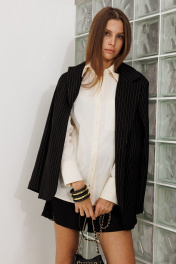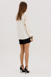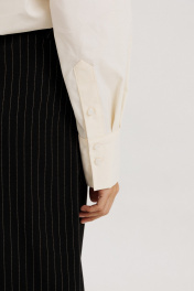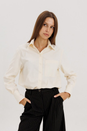 Классическая рубашка сливочного цвета , V-образным вырезом и длинными рукавами, линия плеча немного спущена, рукав притачной,по переду нагрудный накладной карман квадратной формы Застёжка центральная на петли - пуговицы. Низ блузки фигурной формы. Блузка выполнена из рубашечной ткани с добавлением эластана, на манжете застежка на три петли-пуговицы. Длина по спинке 71см, длина рукава от линии шва 60 см, высота манжеты 11 см. Рост модели на фото 178 см.