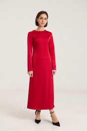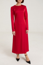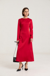 Атласное платье в "правильном" глубоком красном цвете, платье полуприлегающего силуэта,расклешенное к низу, застежка в среднем шве на потайную молнию. Рукав втачной, прямой, по спинке талиевые выточки, по переду нагрудные выточки.Платье без подкладки. Длина по спинке 128 см, длина рукава - 62 см, полуобхват груди -44 см, полуобхват спинки в 42-м размере.