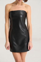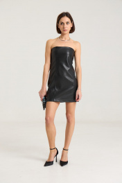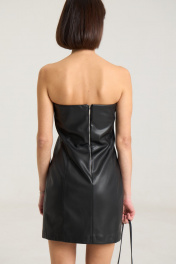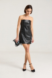 Платье-бандо выполнено измягкой экокожи черного цвета. Платье прилегающего кроя, подчеркивающего силуэт. Изделие имеетбоковые швы спереди и сзади,застежка на декоративную молнию по спинке в среднем шве. Платье на подкладке. Данную модель можно сочетать с балетками, мюлями, босоножками на плоской подошве или обувью на каблуке..Длина по спинке -68 см, полуобхват груди - 41 см, полуобхват бедер -45 см. Рост модели на фото 168 см.