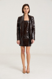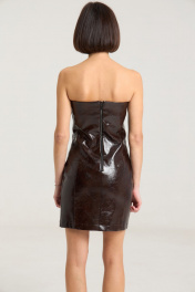 Платье-бандо выполнено из лаковой экокожи шоколадного цвета. Платье прилегающего кроя, подчеркивающего силуэт. Изделие имеетбоковые швы спереди и сзади,застежка на декоративную молнию по спинке в среднем шве. Платье на подкладке. Данную модель можно сочетать с балетками, мюлями, босоножками на плоской подошве или обувью на каблуке.Длина по спинке -68 см, полуобхват груди - 41 см, полуобхват бедер -45 см. рост модели на фото 168 см.