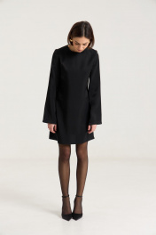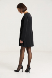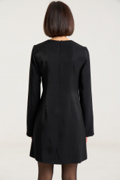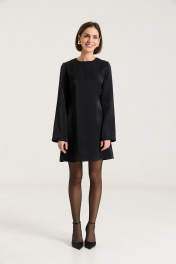 Платье полуприлегающего силуэта, расклешнное к низу, рукав свободный, втачной. По груди нагрудные выточки, по спинке талиевые выточки, застежка на потайную молнию в среднем шве. Платье выполнено излегкой вискозной ткани в черном цвете, ткань имеет красивый серебряный блеск и выглядит дорого.Платье без подкладки. Длина по спинке 85 см, полуобхват груди - 44 см, длина рукава - 63 см, длина плеча - 11 см в 42-м размере. Рост модели на фото 168 см.