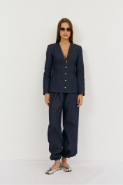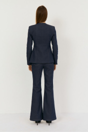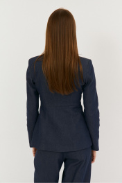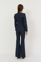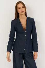 Жакет выполнен из легкой джинсовой ткани в глубоком синем цвете, жакет прилегающего силуэта с глубоким V-м вырезом, застежка центральная на навесные петли. Талия отрезная, Полочка и спинка верхней части с выточками, нижняя часть полочки с выточками и рельефами. Рукав втачной, двухшовный с плечевой накладкой. Жакет на подкладке из хлопка. Такой жакет максимально подчеркнет линию талии, сделает образ притягательным и женственным. Жакет можно ность самостоятельно с любым низом, например с атласной юбкой, белыми брюками или ддинсами, черным низом, а также с джинсами в тон основной ткани из нашей коллекции. Длина по спинке -65 см, рукав 63 см, полуобхват груди - 44 см, полуобхват талии 36 см - в 42 размере.