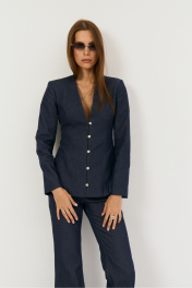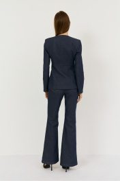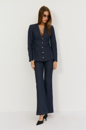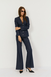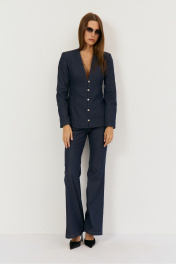 Комплект двухпредметный из жакета и брюк. Жакет выполнен из легкой джинсовой ткани в глубоком синем цвете, жакет прилегающего силуэта с глубоким V-м вырезом, застежка центральная на навесные петли. Талия отрезная, Полочка и спинка верхней части с выточками, нижняя часть полочки с выточками и рельефами. Рукав втачной, двухшовный с плечевой накладкой. Жакет на подкладке из хлопка. Классические расклешенные джинсы выполнены из легкой джинсовой ткани в темно-синем цвете, брюки прилегающего силуэта с высокой посадкой, пояс притачной со шлевками, застежка на молнию и кнопку. По переду расположены карманы. На задней половинке брюк отрезная кокетка и накладные карманы. Длина по боковому шву 108 см, полуобхват талии 35 см, полуобхват бедер 45 см , высота посадки 30 см в 42-м размере.Длина по спинке -65 см, рукав 63 см, полуобхват груди - 44 см, полуобхват талии 36 см - в 42 размере.
