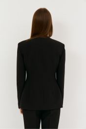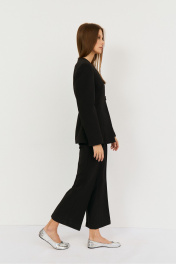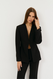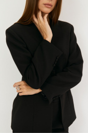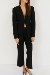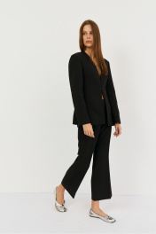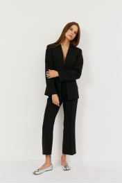 Комплект двухпредметный из жакета и брюк .Жакет однобортный с тремя навесными петлями-пуговицами, на подкладке, полуприлегающего силуэта. Воротник втачной-стойка, рукав двухшовный, спинка жакета разрезная по центру с двумя талиевыми выточками, по передву - две талиевые выточки. Жакет выполнен из костюмной ткани. Длина рукава - 61 см, полуобхват груди - 44 см, длина по спинке- 70см, полуобхват талии -36 см в 42-м размере.Укороченные брюки, слегка расклешенные к низу, прилегающего силуэта, по переду отстрочены стредки, брюки без карманов. По переду застежка - гульфик на молнию и петлю-пуговицу. Брюки выполнены из костюмной ткани. Полуобхват талии - 34 см, полуобхват бедер - 46 см, по боковому шву - 94 см, по внутреннему шву - 64 см. в 42-м размере.