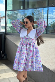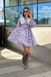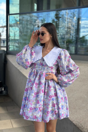 Платье свободного кроя с пышным рукавами с резинкой на манжете, с хлопковым воротником (не съёмный). Длина платья 83 см, обхват груди 84 см, длина рукава 67 см