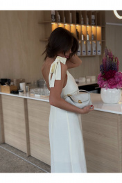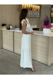 Платье-сарафан прямого кроя в макси длине, с акцентными завязками на плече регулирующие длинну платья. Рост модели 176 см. Длина-125 см, обхват груди-78 см,обхват талии-86 см, обхват бедер-106 см.