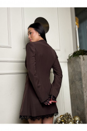 Платье-жакет приталенного кроя, по низу изделия кружево. Рост модели 168 см. Длина-88 см, рукав-67 см, обхват груди-86 см, обхват талии-76 см, обхват бедер-92 см.