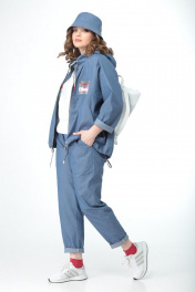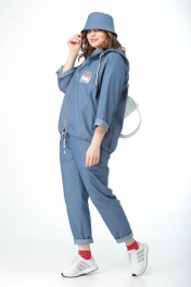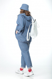 Комплект: куртка, брюки и футболка. Панама в подарок! Куртка оверсайз, с капюшоном, застежка молния. Рукав реглан. По переду карманы, расположенные в наклонных швах. Спинка со средним швом, переходящим в разрез. Декоративный шнур дает возможность присобрать низ куртки и капюшон. Куртка без подкладки. Длина изделия по спинке 71 см, длина по переду 62 см, длина рукава 58 см. Брюки с высокой посадкой на талии зауженные к низу, с глубокими карманами, по поясу резинка. Без застежки. Длина брюк 95 см. Окружность по талии (резинка не растянута) размер 44-66 см 46-70 см 48-74 см 50-78 см 52-84 см 54-88 см Футболка трикотажная с коротким рукавом