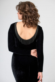 Нарядное сногсшибательное платье классической длины из мягкого эластичного бархата. Прилегающего силуэта, без застежки, с длинным рукавом. Горловина овальная, спинка соблазнительно открыта. По вырезу спинки бахрома из тонких ниточек бусин. Длина платья на фигуре- 105 см см (на вешалке-112 см) Длина рукава: 58 см Вырез по спинке: размер 42-46 30 см (замеры от шейного позвонка), бюстгальтер не закроет! размер 48-52 22 см бюстгальтер закрыт! Платье облегает фигуру, движения не сковывает за счет эластичности ткани.